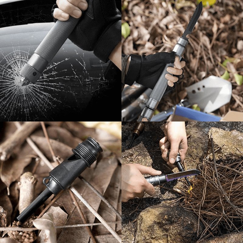 Equipamento multifuncional com acessórios integrados como flintstone, faca/canivete, quebra-gelo, quebra-vidro e abridor de garrafa.